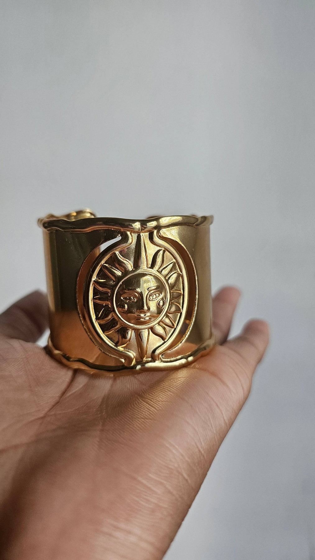 Stunning wide bohemian cuff featuring an intricately detailed raised sun face with flowing rays and serene expression.