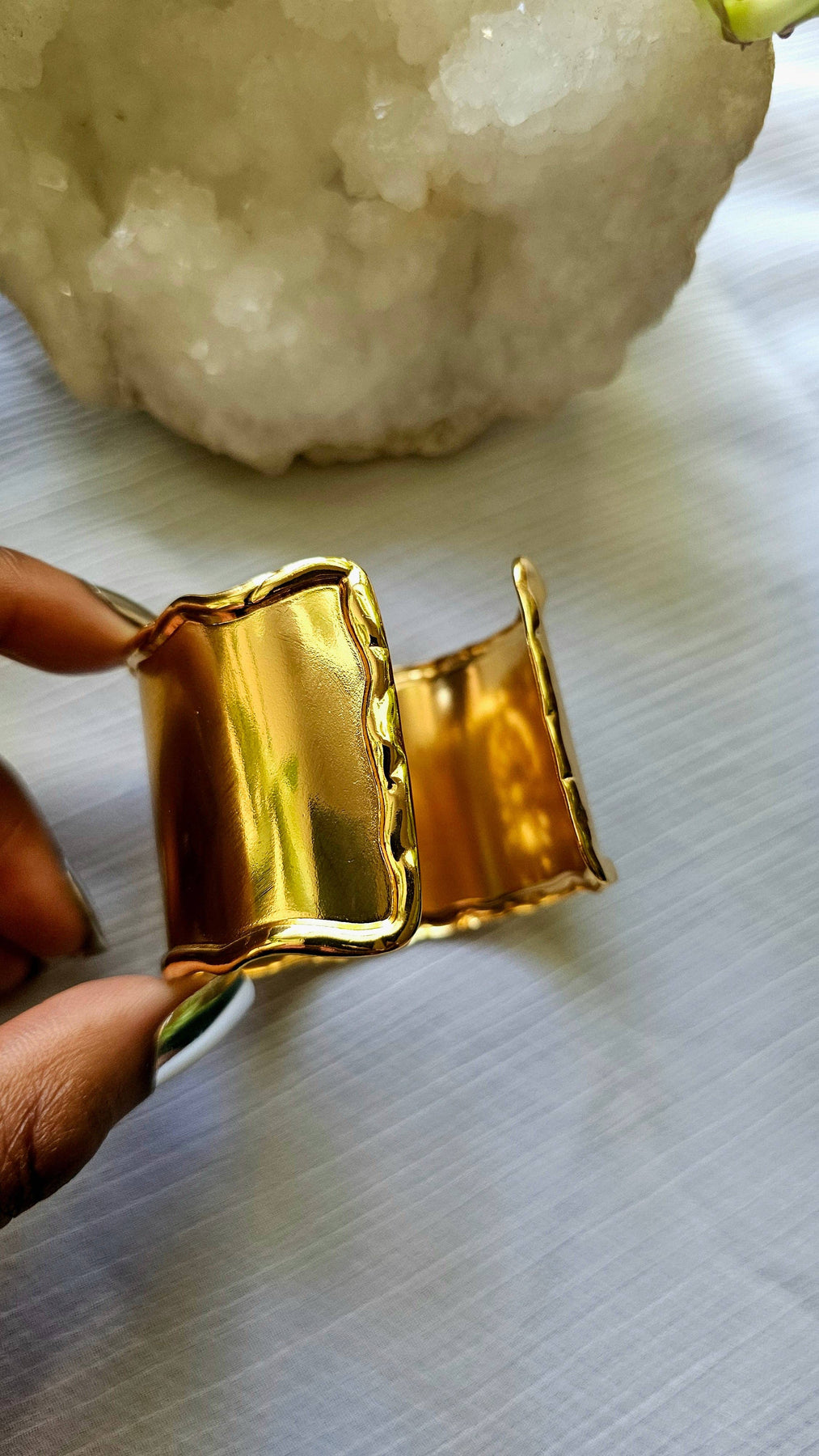 **Features:** - Wide statement design (approx. 1.5-2 inches) - Adjustable open-back for comfortable fit