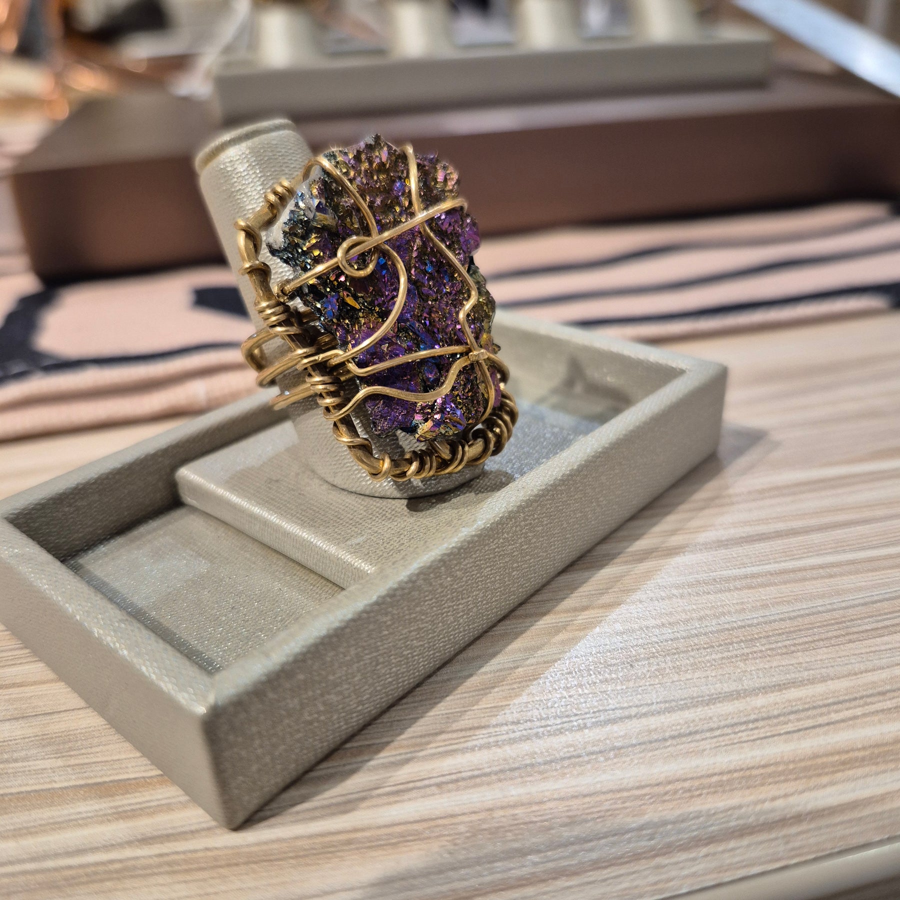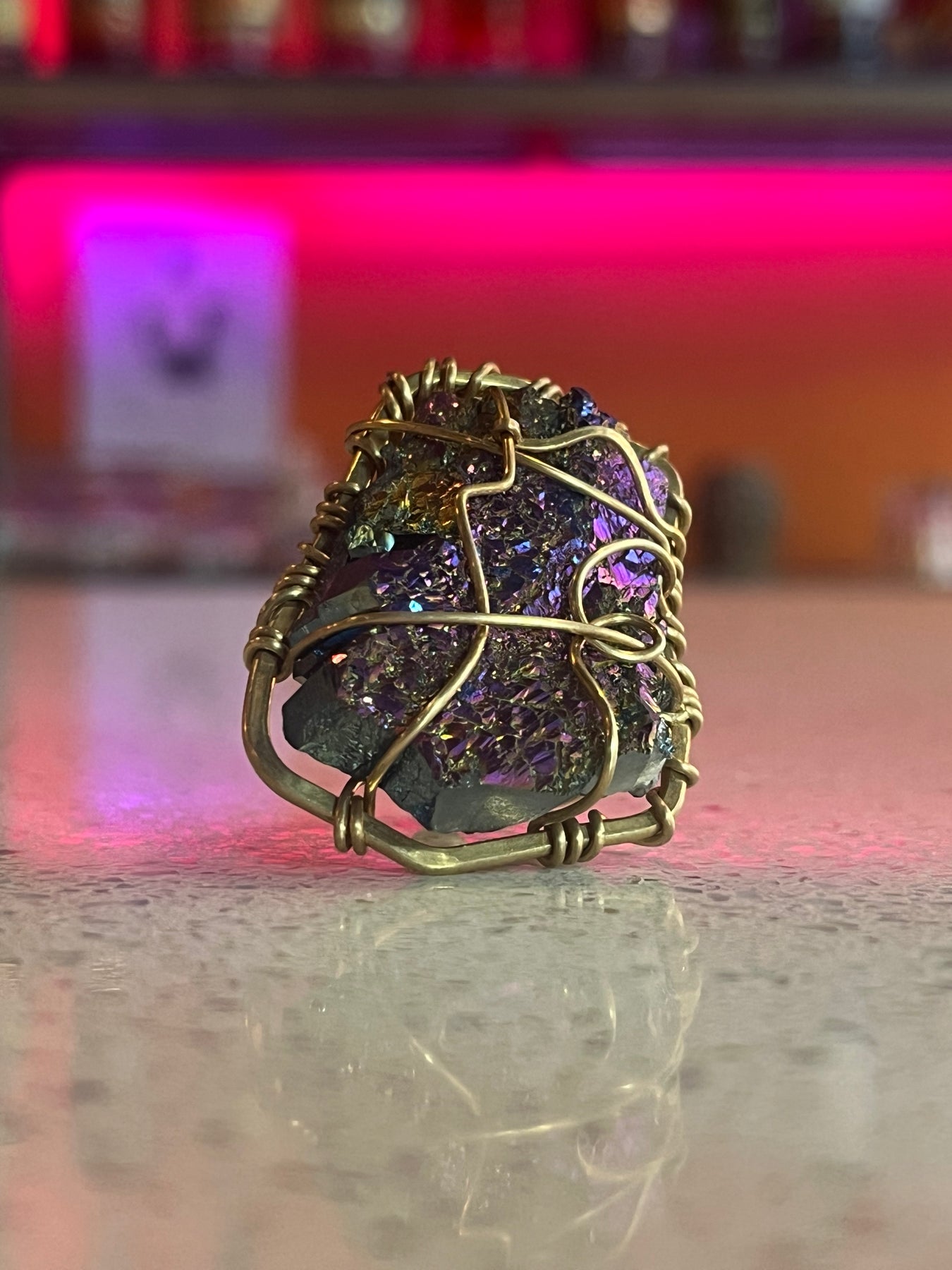 Handcrafted titanium quartz ring inspired by intuitive artistry. This unique piece features a 1 1/2 inch stone, masterfully wrapped in high quality warm brass, creating a striking contrast of metal and natural stone.